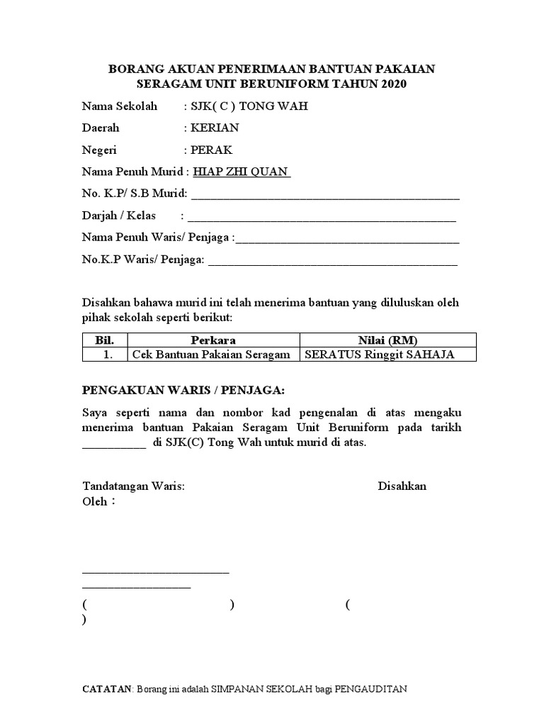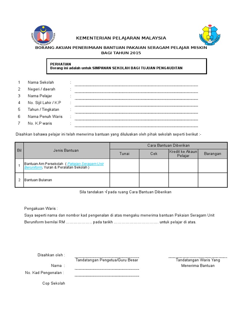 Borang Akuan Penerimaan Bantuan Pakaian Seragam Tahun 2020 Pdf